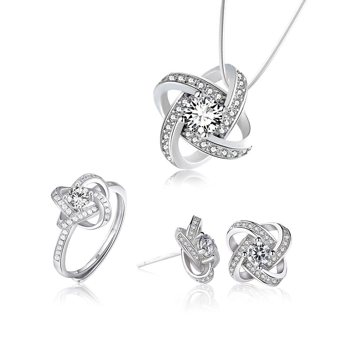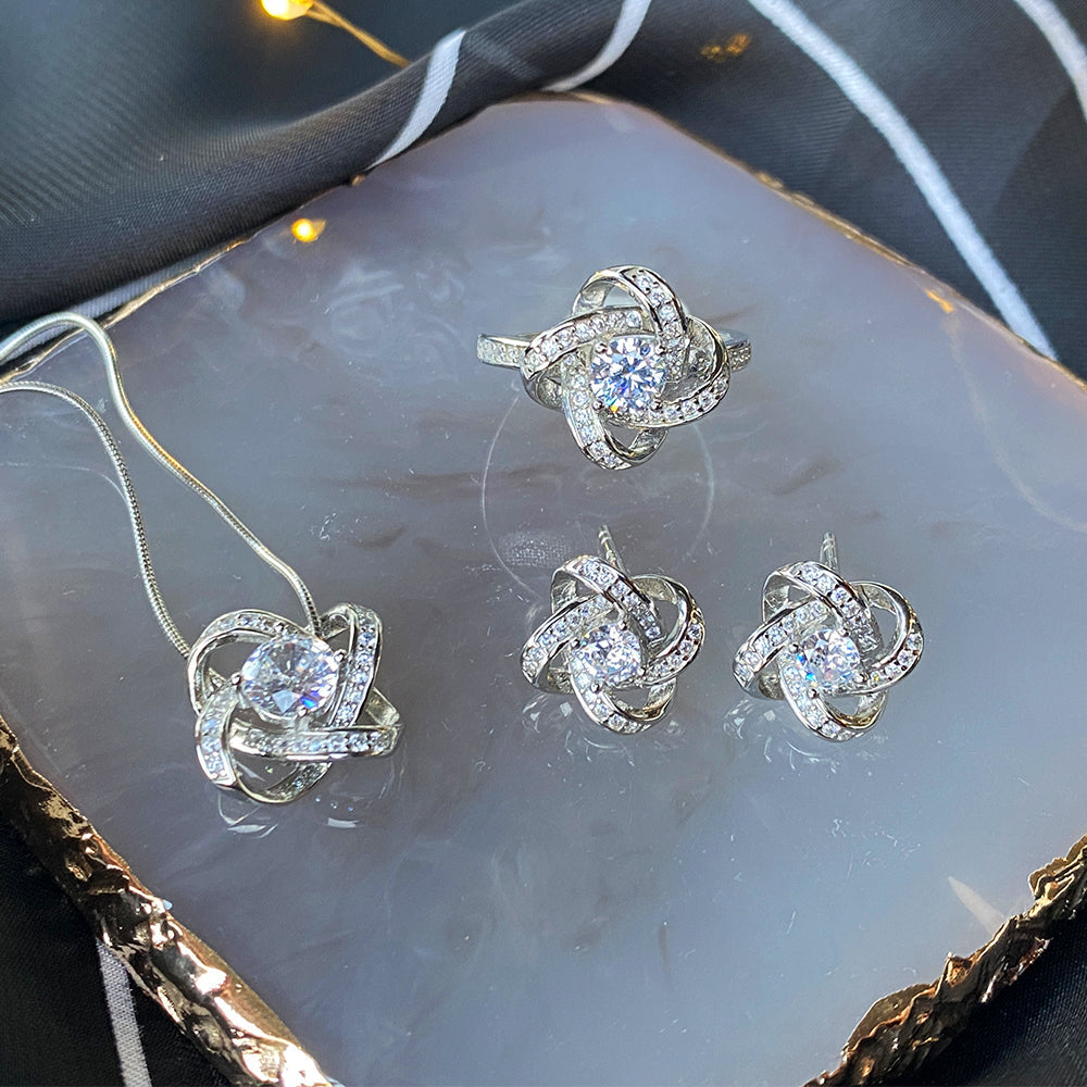 Each item is meticulously crafted in .925 silver with lavish 18K white gold finishing and adorned with natural zircon gems, so the trio shimmers with a luxurious glow.