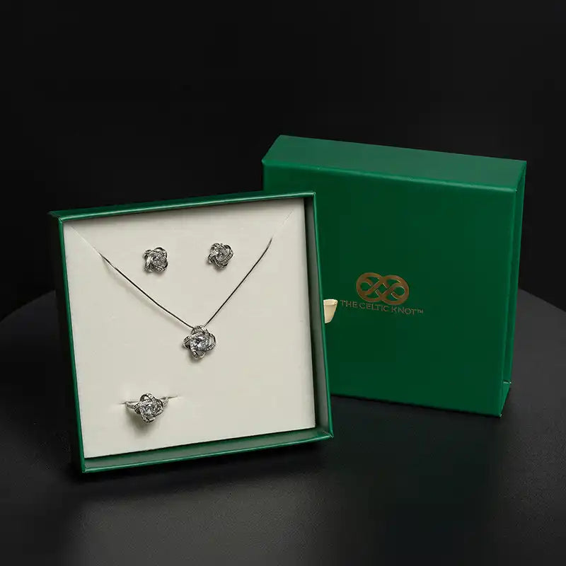 This ultimate Celtic Knot set includes the pendant, earrings and ring – three beautifully coordinated pieces designed to surround her (or you!) with faith, hope, and love from head to hand. Gifting all three at once is like presenting an instant heirloom collection steeped in Irish tradition.