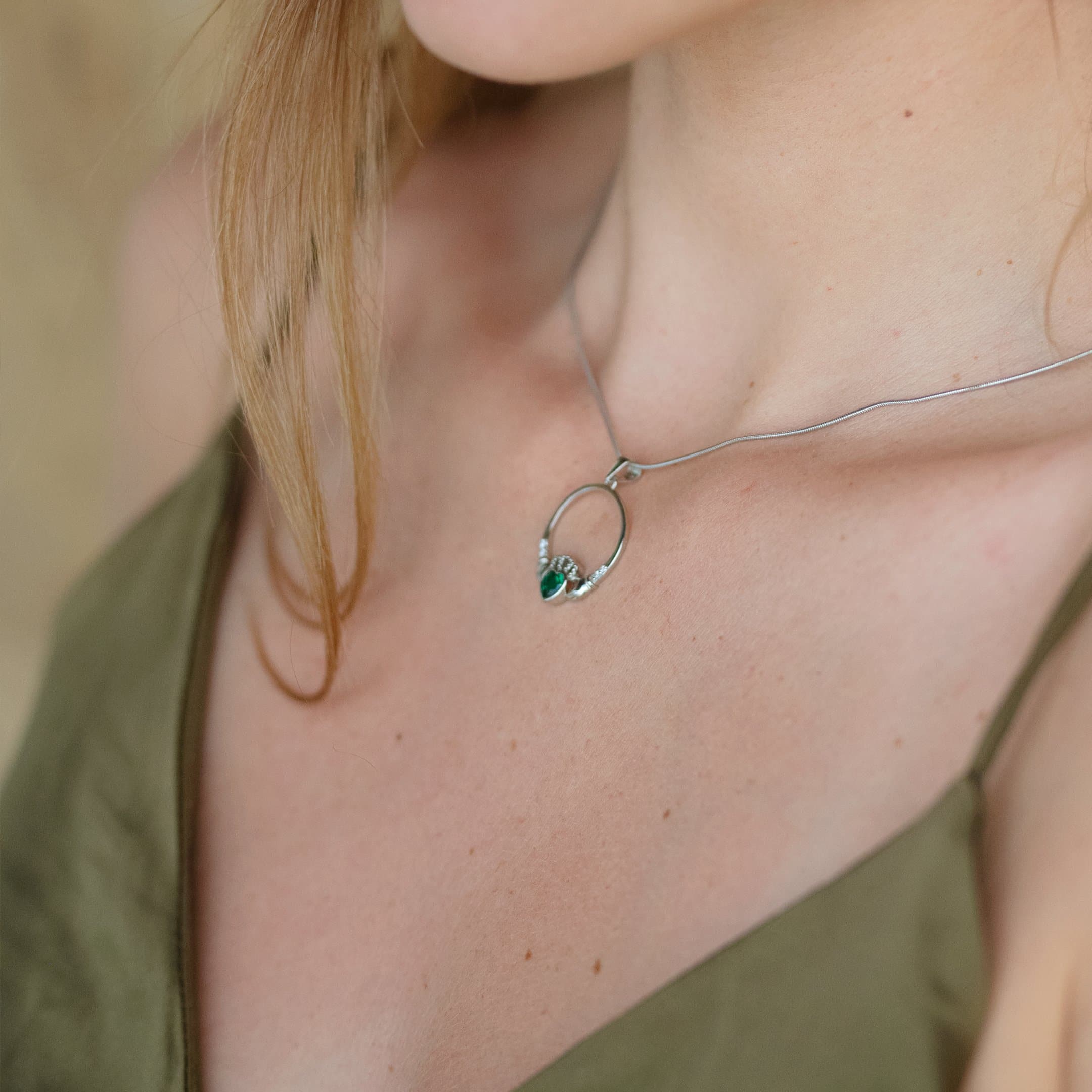 Handcrafted from solid sterling silver with a radiant 18K white gold shine, this pendant sparkles with an emerald-green zircon at its center, as vibrant as the Emerald Isle itself.