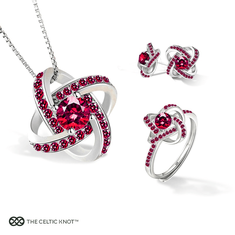 Each piece complements the others – a perfect harmony of sterling silver, 18K white gold finish, and rich garnet red.