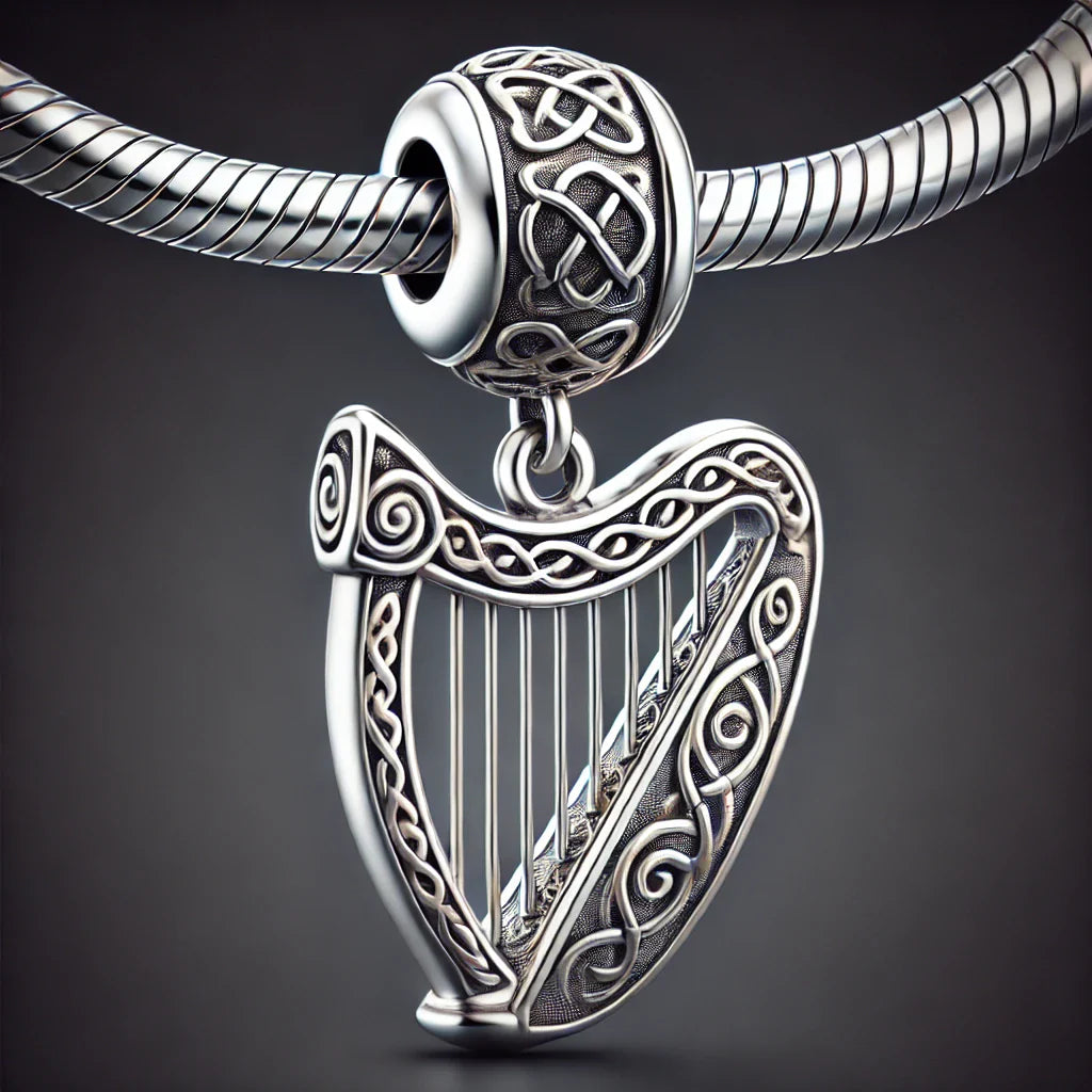 The charm itself is gracefully fashioned to resemble a tiny Celtic harp, complete with delicate string detailing.