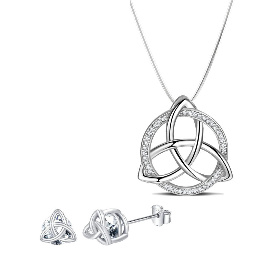 This 2-Piece Duo Set combines our beloved pendant and matching earrings into one harmonious bundle of Celtic charm. It’s a perfect pairing – the pendant graces the neckline while the earrings frame the face, together creating a complete story that celebrates your heritage from every angle. When worn as a set, the Triquetra symbols seem to play off each other: each time you turn your head or catch a glimpse in the mirror, you’re reminded of the twofold blessings you carry. It’s like getting a double dose of that eternal protection and love the Trinity Knot represents – one near your heart, and two dancing by your cheeks. (Double the sparkle, double the charm, and possibly double the compliments from strangers – don’t say we didn’t warn you!)