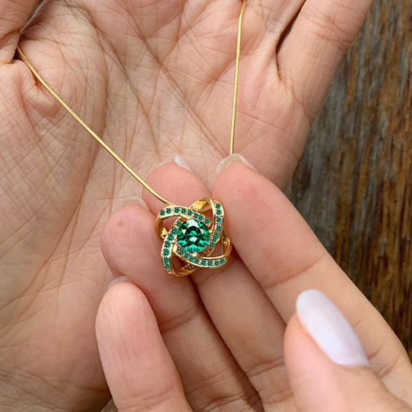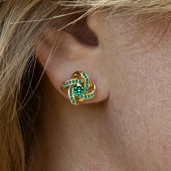 This 2-Piece Emerald Duo Set in Yellow Gold combines our Celtic Knot emerald pendant and earrings into one magnificent gift. Both pieces shine with emerald-green stones and 18K yellow gold splendor, giving the set a timeless, heirloom-quality charm.