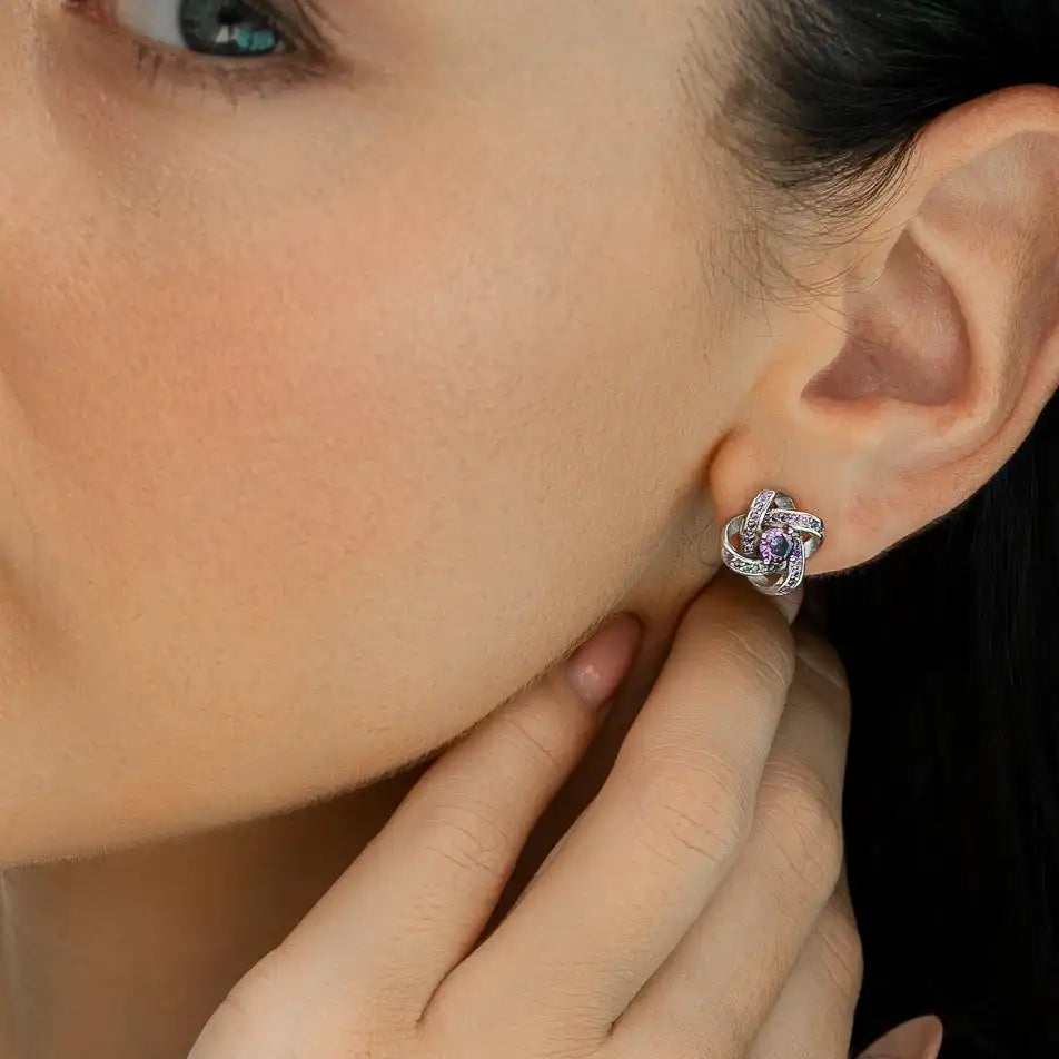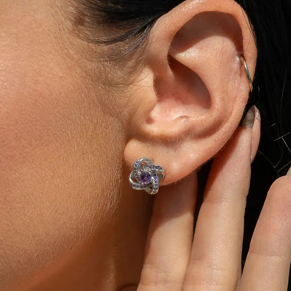 Each earring showcases a lovely violet amethyst set in an eternal knot design – a nod to enduring love and deep wisdom. These earrings don’t just catch the light; they seem to carry a little piece of twilight wherever she goes, inspiring calm confidence.