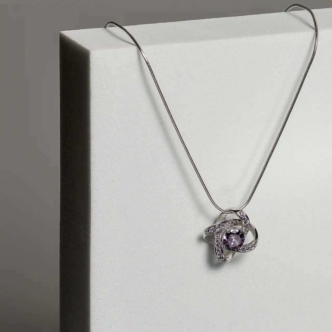 Handcrafted from .925 sterling silver and bathed in 18K white gold, the pendant features a mesmerizing amethyst center that “dances” with shades of purple in the light.