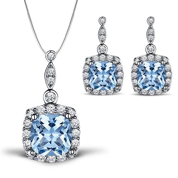 • Included Pieces: Winter Diamond Pendant (18K white gold finish, blue topaz center stone on 18"+4" adjustable chain) + Winter Diamond Earrings (18K white gold finish, blue topaz drop studs) – a perfectly matching set