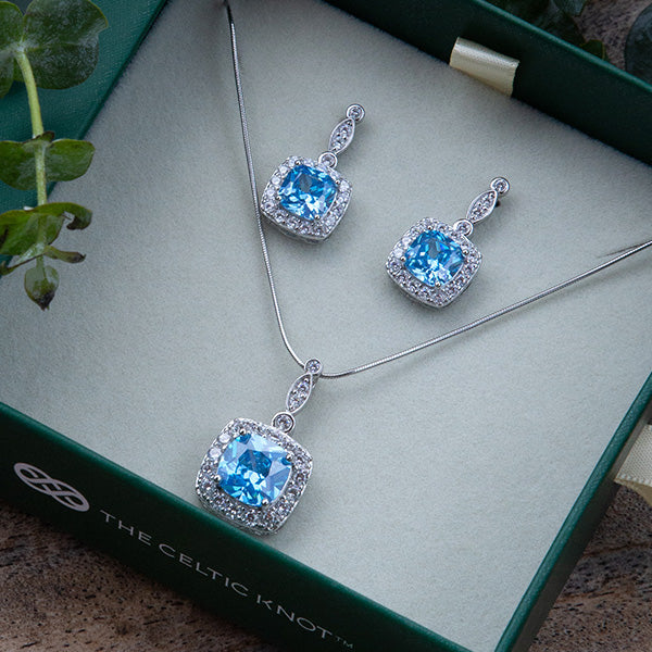 Beyond their beauty, the Trinity Knot motifs in this set carry profound significance. The Triquetra has long symbolized the power of three in Celtic lore – be it the Maiden, Mother, Crone of womanhood or the Father, Son, Holy Spirit of faith – ultimately it speaks to an unbreakable bond and the idea that good things come in threes. When you wear both the pendant and earrings, you’re essentially wrapping yourself in double the symbolism and style. Crafted from fine sterling silver with 18K white gold, and adorned with genuine blue topaz gemstones, these pieces radiate a serene blue light that calms the soul and delights the eyes. From a casual lunch to a festive family gathering, this versatile set complements any outfit with its timeless elegance.